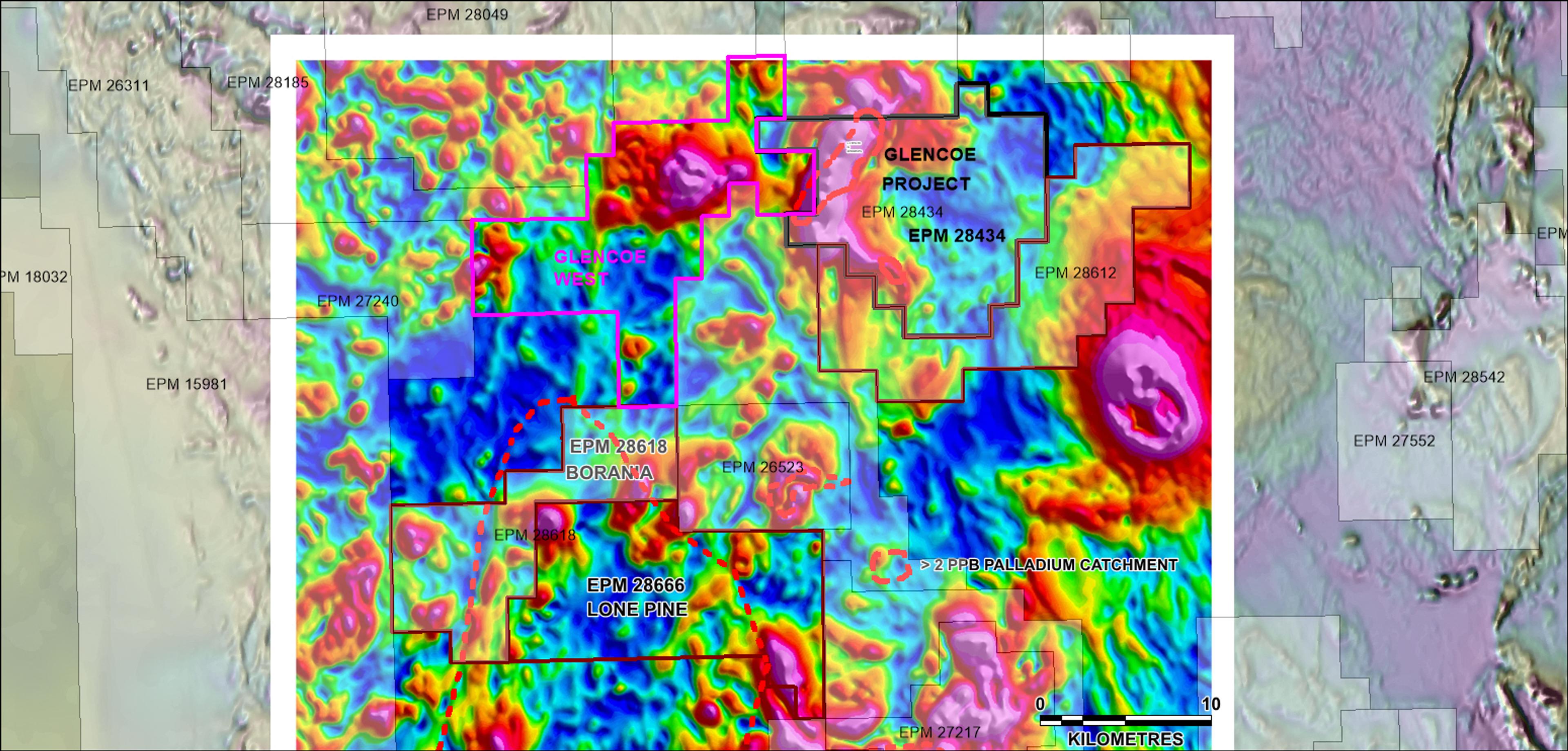 Previous exploration by Ridge Exploration Pty Ltd identified and evaluated the gently dipping layered Glencoe ultramafic intrusive with several lines of soil sampling. A weak, but coherent zone of copper, nickel, gold, platinum, and palladium anomalism was identified but was not closed off. The low level of the anomalism led Ridge to surrender the EPM in 2015.